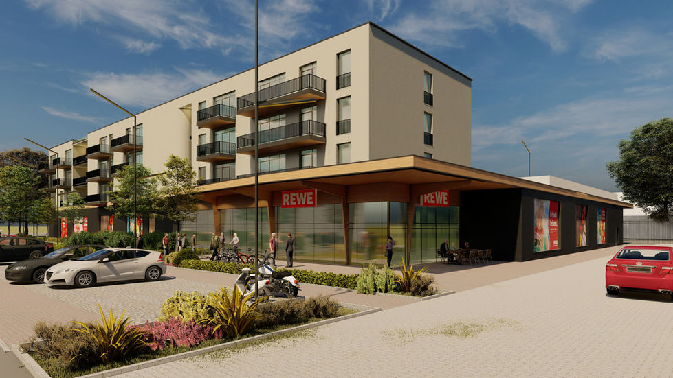 Die Planungsaufgabe bestand darin, einen REWE-Markt mit einer aufgeständerten, dreigeschossigen Wohnbebauung zu kombinieren.